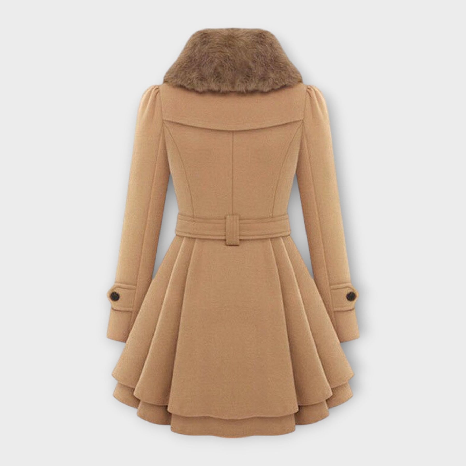Elivara combines feminine sophistication with warming comfort. The flared cut gives the silhouette a graceful shape, while the soft collar adds a touch of luxurious elegance to the coat. A piece that radiates both strength and delicacy.