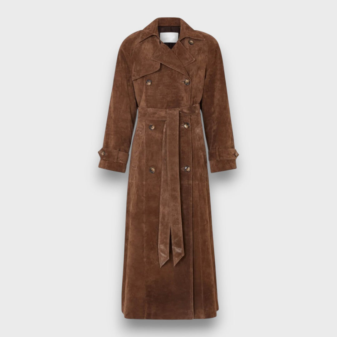 Marceline is the kind of trench coat that turns quiet moments into scenes of elegance. Crafted from soft vegan suede, it carries a richness you feel the moment you slip it on — warm, fluid, and effortlessly refined. Its long, sculpted silhouette and classic double-breasted lines create a look that’s both timeless and striking, the kind of outerwear that makes every cold-weather outfit feel intentional and elevated.