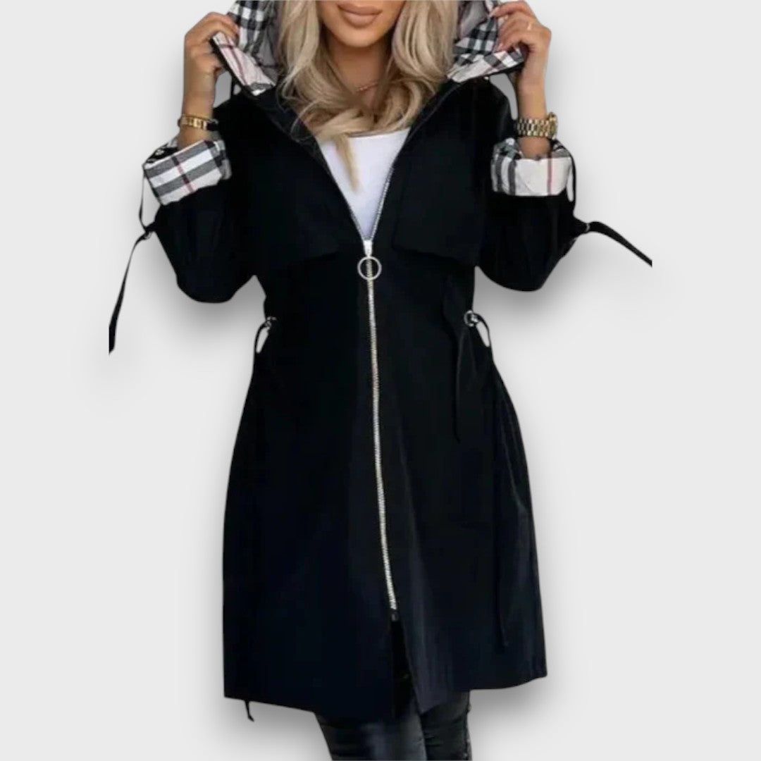 The Natalie coat combines elegance and functionality in a timeless design. With its practical zipper, adjustable waist, and generous hood, it is the perfect choice for cool days. The subtle check details in the lining add a stylish touch to the look, while the loose fit guarantees you freedom of movement and comfort.