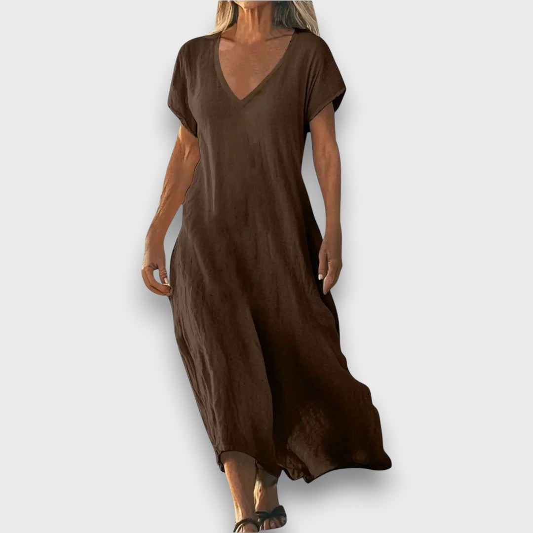 Roselynn is ease you can feel the moment you slip it on. Light, breathable, and softly flowing, it moves with the body instead of against it — creating a silhouette that feels relaxed yet quietly elegant. The gentle V-neckline and fluid cut bring a natural sense of balance, making it just as fitting for slow summer mornings as for warm evenings out.