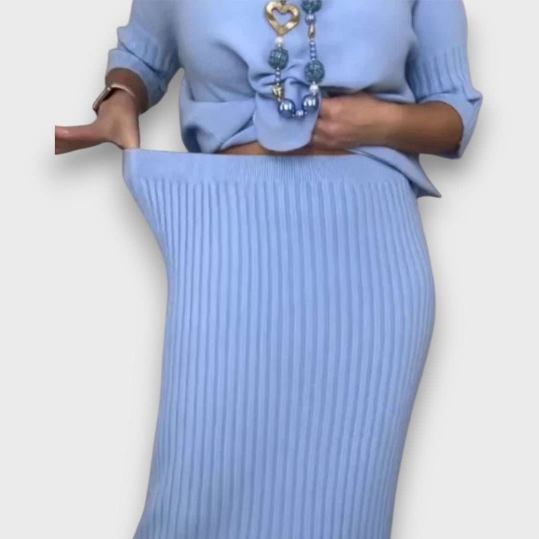 Ribbed midi silhouette – the skirt’s subtle rib texture adds dimension and elongation for a naturally refined look.